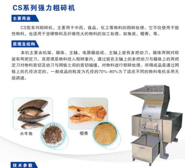 該機(jī)是中藥破碎的理想設(shè)備,其破碎的物料可作為提取、出口的中藥顆粒、粉碎細(xì)料用。破碎的物料出粉率低。尤其適用于中藥中堅(jiān)硬、難粉的物料。如堅(jiān)硬的根類、藤類,各種角類的粗碎加工。